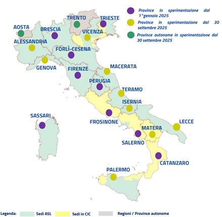 Come illustrato sulla cartina che segue, la prima fase sperimentale della riforma della disabilità è stata avviata il 1° gennaio 2025 su nove province. Una seconda è partita il 30 settembre 2025 su ulteriori undici territori.